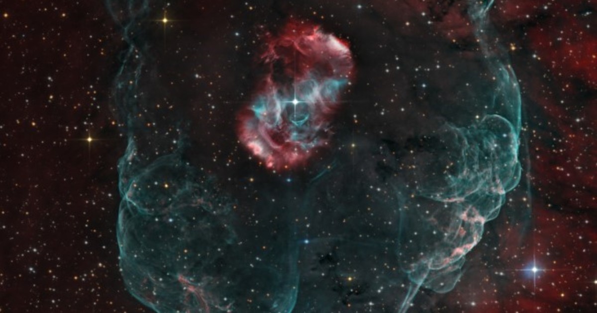 Se encuentra a 4200 años luz de distancia, en la constelación austral de Norma.Se resaltan el brillante gas de hidrógeno atómico en rojo y el oxígeno en tonos verdosos....